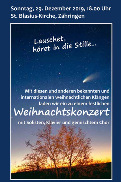 Weihnachtskonzert Sopran: Franziska Weiß | Querflöte: Ortrun kestel | Klavier: Claudia Janz Gemischter Chor Zäringia | Leitung: Claudia Janz Leitung: Boris Böhmann |