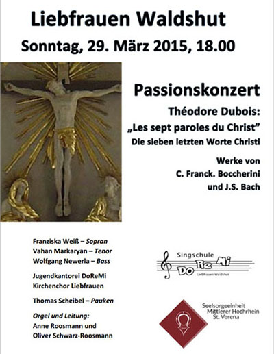 Sonntag, 29. März 2015,18.00 Uhr: Liebfrauenkirche Waldshut-Tiengen, Marienstraße 10 Théodore Dubois: "Les sept paroles du Christ" (Die sieben Worte Christi am Kreuz) |