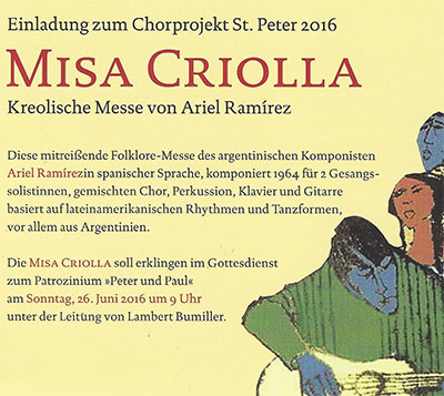 Sonntag, 26. Juni 2016, 9.00 Uhr: Katholische Kirche St. Peter und Paul, St. Peter Misa Criolla Kreolische Messe von Ariel Ramírez mit Solistinnen, Chor und Orchester |