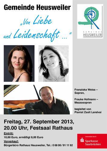 27. September 2013, 19.30 Uhr Rathaus Heusweiler bei Saarbrücken Konzertabend "Von Liebe und Leidenschaft", Heusweiler Rathauskonzerte |
