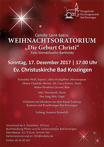 Sonntag, 17. Dezember 2017, 17.00 Uhr: Ev. Christuskirche, Bad Krozingen Weihnachtsoratorium "Die Geburt Christi" Felix Mendelssohn Bartholdy |